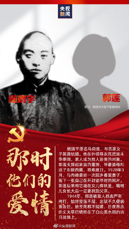 那时他们的爱情【杨靖宇妻子至死都不知老公牺牲】在杨靖宇领导农人武装斗争期间,妻子郭莲带家人东躲西藏。郭莲将杨靖宇的照片缝进女儿棉袄,吩咐儿女长大后一定要找到父亲。1944年,郭莲被敌人抓去严刑拷打,始终坚强不屈,出狱不久便病重逝世。她至死都不知日夜怀念的老公早已牺牲。中国共产党建立100周年